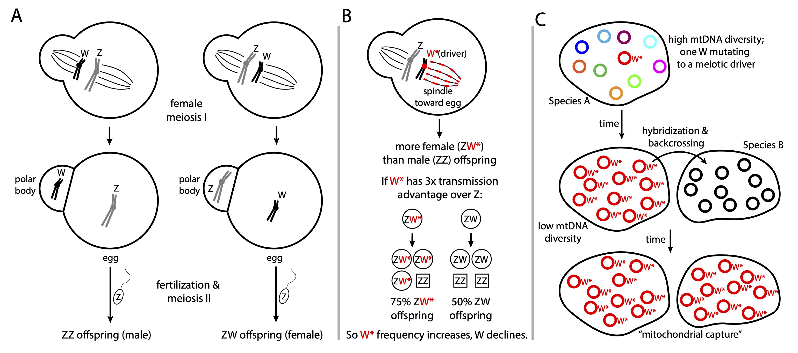 This situation is particularly intriguing in species with Z / W sex chromosomes (e.g., birds, butterflies), meaning females are ZW and males are ZZ. There, a driver on the W or Z can cause the sex ratio of a female’s offspring to be biased towards females (in the case of a W driver) or males (in the case of a Z driver). The figure below illustrates meiosis and the consequences of a W driver: